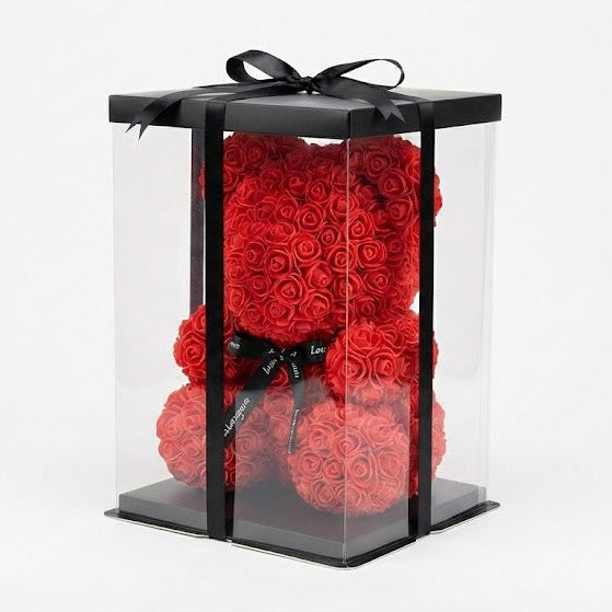 Wybierając opcję „Z Pudełkiem”, otrzymasz misia zapakowanego w luksusowe, przezroczyste etui ochronne, przewiązane elegancką czarną wstążką z napisem. Prezent jest gotowy do wręczenia natychmiast po wyjęciu z paczki.